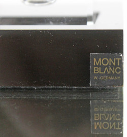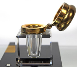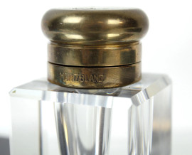Montblanc, calamaio da scrivania in cristallo, tappo in ottone, base di linea rettangolare in resina nera, cm 9,5x12x2,5, (graffi).