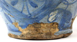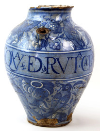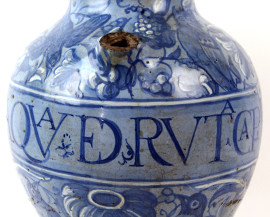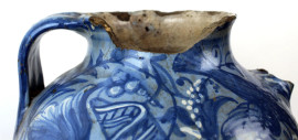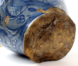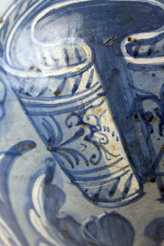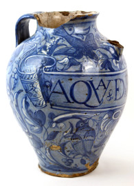 Orciolo in maiolica, XVIII secolo, decorato in monocromia blu, cm h 36 (difetti e mancanze)