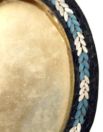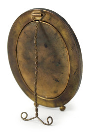 Piccola cornice portafoto di linea ovale in metallo dorato e micromosaico, cm 11x8, metà XX secolo