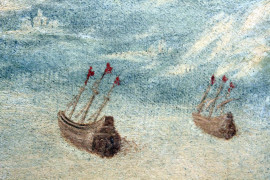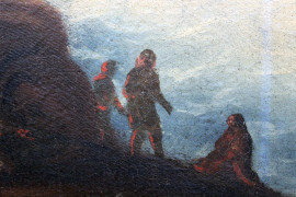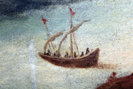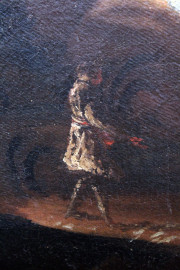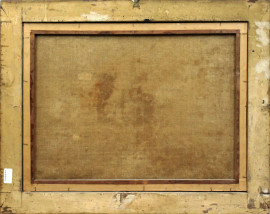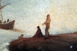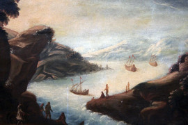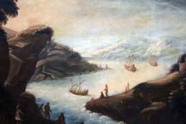 Pittore del XVIII secolo, Paesaggio fluviale con imbarcazioni e figure, olio su tela, cm 66,5x88, entro cornice.