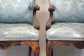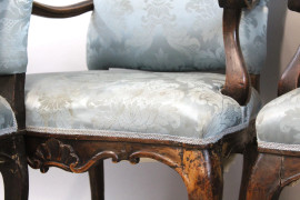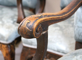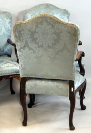 Quattro poltrone Luigi XV in noce, schienali e sedute imbottiti e rivestiti in tappezzeria damascata celeste, cm h 112, (difetti, segni del tempo)