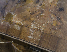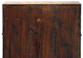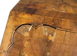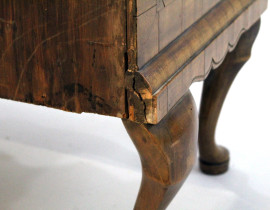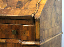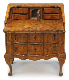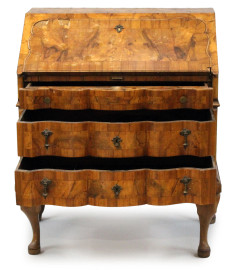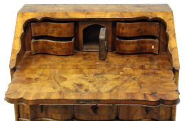 Ribaltina in noce e radica, XVIII secolo, fronte mosso a tre cassetti, calatoia celante scarabattolo con quattro cassettini e vano, cm 93x76x40, (difetti)