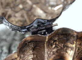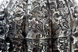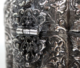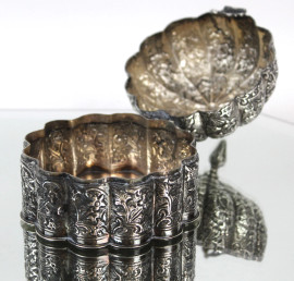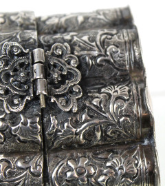 Scatola in argento con decori floreali cesellati e sbalzati, manifattura orientale, cm h 13, gr. 340, (difetti).