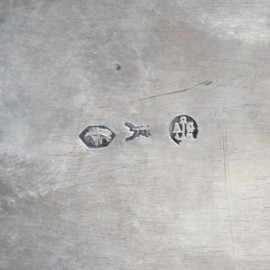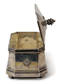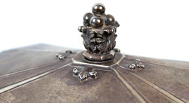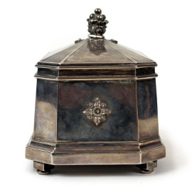 Scatola in argento di linea ottagonale, Milano, XIX secolo, corpo liscio, monogramma e motivi floreali cesellati e sbalzati, presa a foggia di frutto, cm 17x13,5x21,gr.1530.