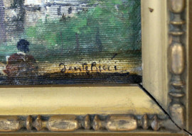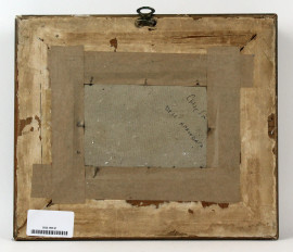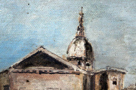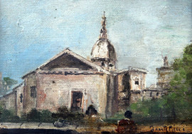 Scorcio con chiesa, olio su tela applicata su cartone, cm 13x17,5, firmato, entro cornice