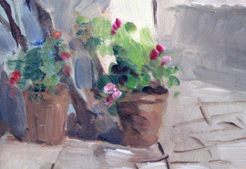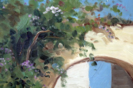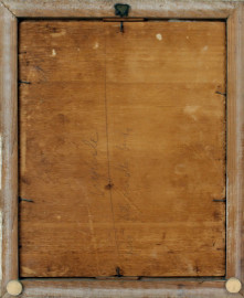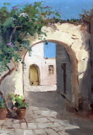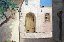 Scorcio di paese, olio su compensato, cm 29,5x24, XX secolo, entro cornice.