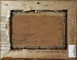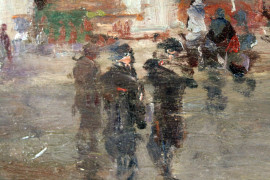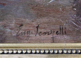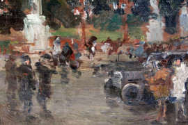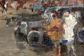 Scorcio di strada con automobile e figure, olio su tavola, cm 17x26, firmato, entro cornice.