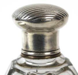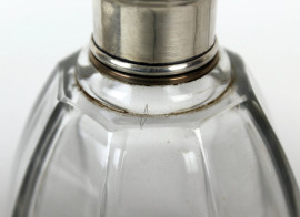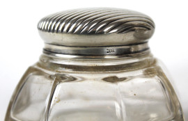 Servizio da toeletta, composto da quattro oggetti in vetro con tappi in argento, cm h 13, inizi XX secolo.