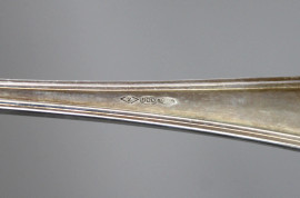 Servizio di posate in argento, composto da 12 forchette, 12 cucchiai, 12 coltelli, 12 forchettine, 12 coltellini, 2 posate da portata, 2 posate da insalata, 12 cucchiani, XX secolo, peso netto gr. 2468