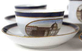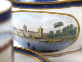 Servizio in porcellana bianca con decori policromi dipinti a mano raffiguranti Vedute del basso Lazio e Campania, marchio Le Nove, XVIII secolo, (difetti e restauri).