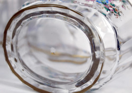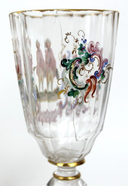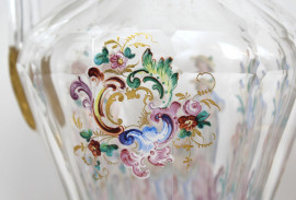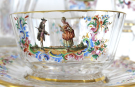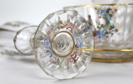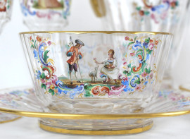 Servizio in vetro dipinto composto da una caraffa, quattro calici, due coppette con due piattini, alt. max cm 30, (difetti).