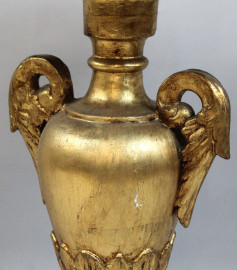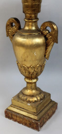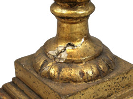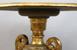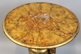 Tavolino costruito con elementi antichi, piano laccato a finto marmo e gamba a balaustro in legno dorato poggiante su piede modanato, cm h 71, diam. cm 55, (difetti)