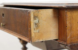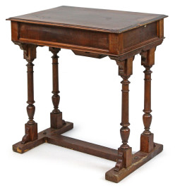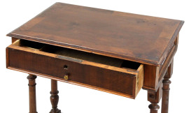 Tavolino da lavoro in noce, fine XIX secolo, ad un cassetto, montanti a balustro, cm 67x59,5x41,5