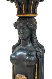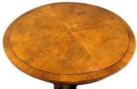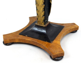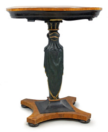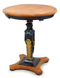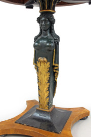 Tavolino di linea circolare, XIX secolo, piano lastronato in noce e radica di noce, gamba centrale ebanizzata e scolpita a busto di cariatide e foglia d'acanto, particolari dorati, cm h 84x75,5.