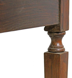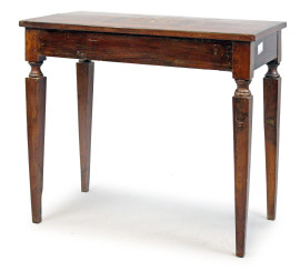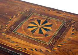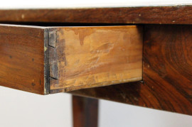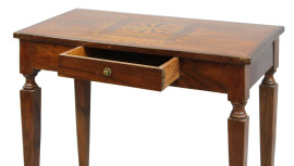 Tavolino Luigi XVI, lastronato ed intarsiato in varie essenze, piano centrato da decoro geometrico, un cassetto nella fascia, gambe troncopiramidali, cm 73x80,5x43, (difetti)