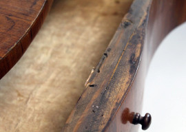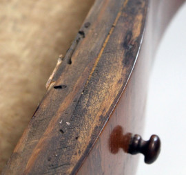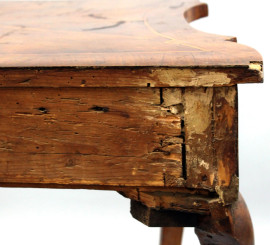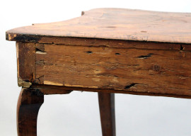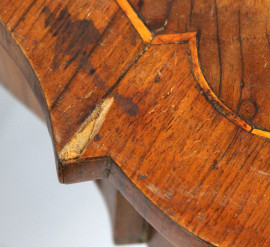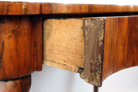 Tavolo consolle, XIX secolo, in legno impiallacciato con filettature in bosso, fascia e gambe mosse, ad un cassetto, cm 77x103x53, (difetti).