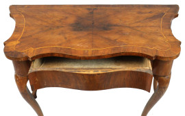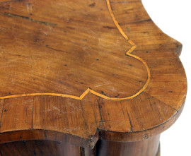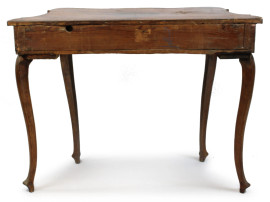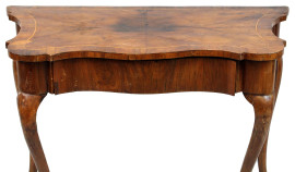 Tavolo consolle, XIX secolo, in legno impiallacciato con filettature in bosso, fascia e gambe mosse, ad un cassetto, cm 77x103x53, (difetti)