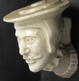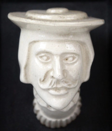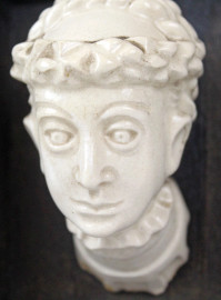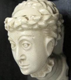 Testa di uomo con cappello e testa di donna con ghirlanda di fiori, in porcellana bianca, copia di Andrezej Mierzejewski, cm 14,5x12, entro cornici.