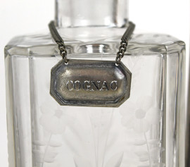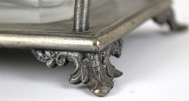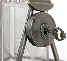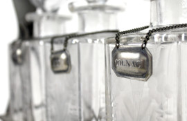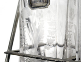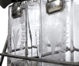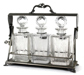 Tre bottiglie da liquore in cristallo controtagliato entro portabottiglie in peltro, cm 31,5x35x11, XX secolo