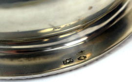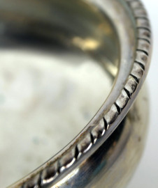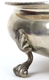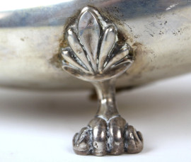 Vaschetta in argento di forma ovale, poggiante su quattro piedini a foglia ritorta, cm 8,5x23x16,5 , XX secolo, gr.520