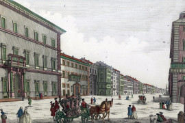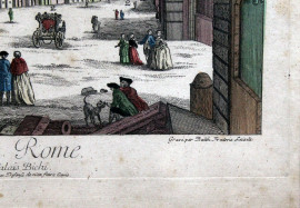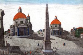 Veduta di Piazza del Popolo e di Palazzo Colonna di Sciarra, coppia di stampe acquarellate del XVIII secolo, cm 34x45, entro cornici