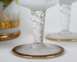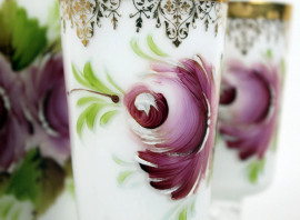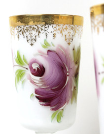 Versatoio e quattro bicchieri in vetro bianco con decori floreali policromi e finiture dorate, alt. max cm 30, XX secolo.