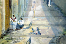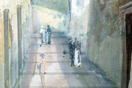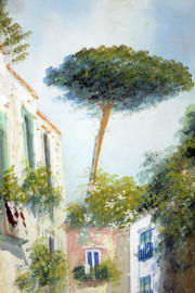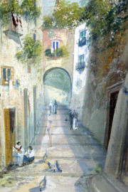 Vicolo della vecchia Napoli, gouache su carta, cm 41x18, firmato Guglielmo Giusti, entro cornice.