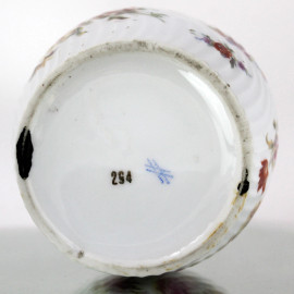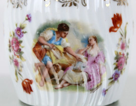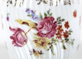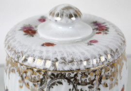 Zuccheriera in porcellana bianca con decori floreali policromi e finiture in oro, cm h 14, marca sotto la base, (lievissimi difetti)