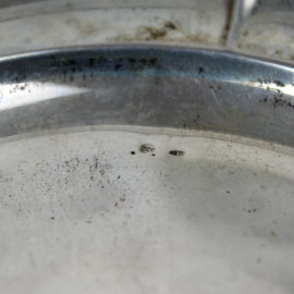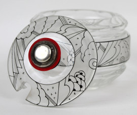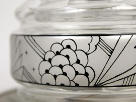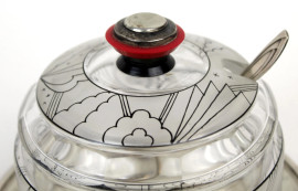 Zuccheriera in vetro con decori astratti dipinti a mano, presa in argento e perspex, piattino e cucchiaino in argento non pertinenti, cm h 11,gr.85, XX secolo