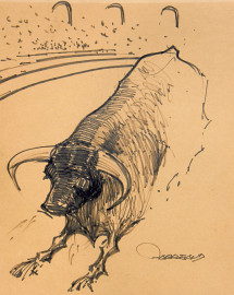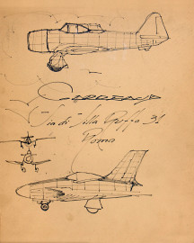 Aeropittore del Novecento, Studio di aerei, inchiostro su cartone, cm 34x29, con cornice, firmato Carreaud al centro, al retro studio per corrida