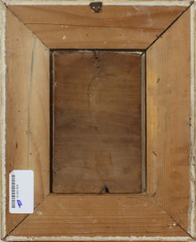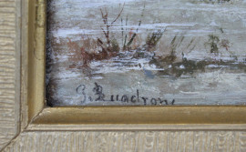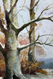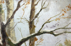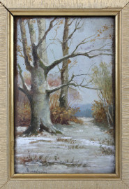 Albero innevato, olio su tavola, cm 18x11, firmato, entro cornice.