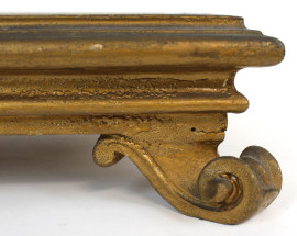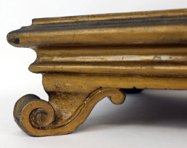 Alzata in legno dorato, XX secolo, piano a specchio poggiante su quattro piedini a ricciolo, cm h 9x41x27.