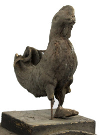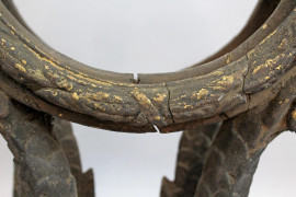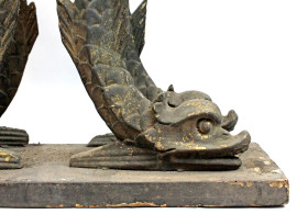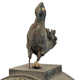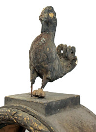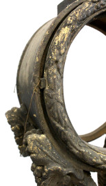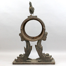 Antica cassa di orologio da tavolo in legno intagliato e dorato, decoro superiore a foggia di gallo, cassa rotonda poggiante su quattro montanti scolpiti a motivo di teste di delfini, base rettangolare, cm h 77x51x15,5, (difetti e mancanze).