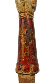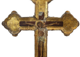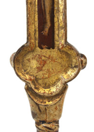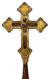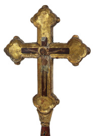 Antica croce astile in legno e stucco dorato, due facce raffiguranti Cristo Crocefisso e terminazioni dei bracci di forma trilobata, cm h 41,5x22x2 (base in plexiglass cm 4x10,5x6), (difetti e restauri).