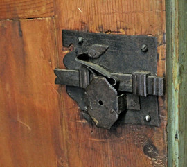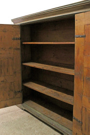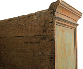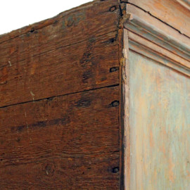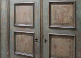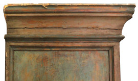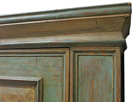 Armadio in legno laccato, XVIII secolo, cappello modanato e fronte a due ante pannellate, cm h 204x187x55, (difetti).