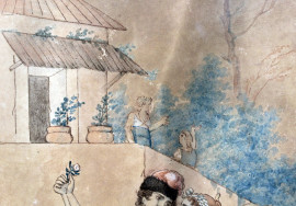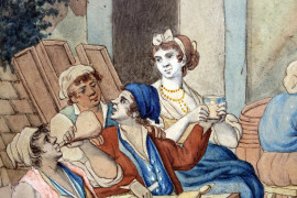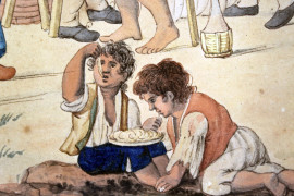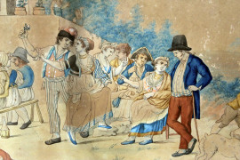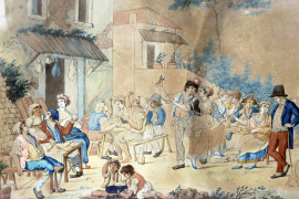 Bambocciata napoletana, tecnica mista su carta, cm 45x61, XIX secolo, entro cornice, (difetti sulla carta)