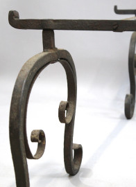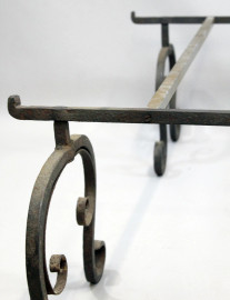 Base per tavolo in ferro battuto, poggiante su quattro montanti a ricciolo riuniti da applicazioni recenti, cm h 40x150x130, (difetti).