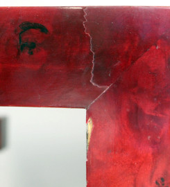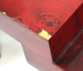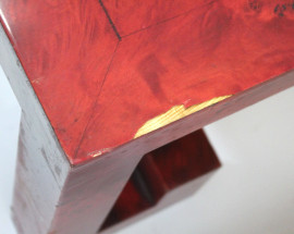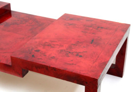 Basso tavolo in legno laccato rosso, XX secolo, cm h 42x150x70, (difetti).