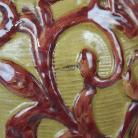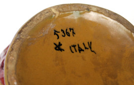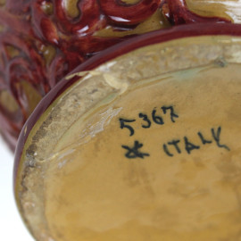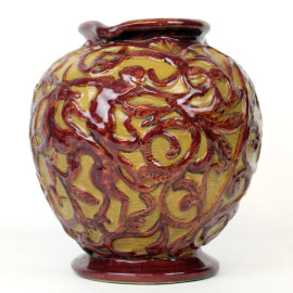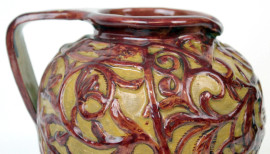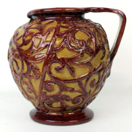 Brocca in ceramica dipinta e smaltata nei toni del marrone e del bordeaux, decori fogliacei a rilievo, cm h 18,5, marchio alla base, (restauri e lievi sbeccature).