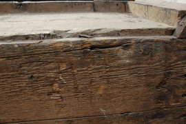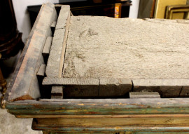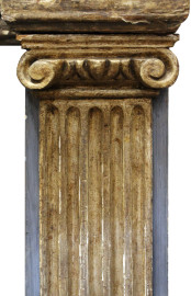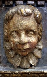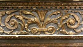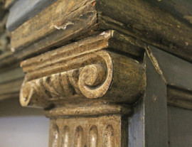 Camino in legno intagliato, dorato e laccato, Veneto, XVIII secolo, piano di linea spezzata, fascia modanata con cornice a dentelli, fronte centrato da fregio scolpito a motivo di foglie d'acanto e girali fogliacei inquadrati da teste di cherubini ai lati, montanti realizzati a motivo di colonne ioniche [..]