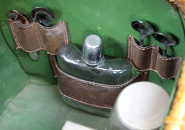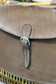 Cestino in vimini con tasca esterna, finiture in pelle e foderatura interna, contenente vari oggetti ed accessori da barman, cm h 55x47x31, XX secolo, (difetti e segni di utilizzo).