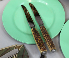 Composto da: una bottiglia in vetro da liquore, quattro cucchiaini e tre shaker, due scatole in metallo argentato, quattro piattini verdi in perspex, set di quattro forchette e quattro coltelli marcatiGucci, un pinza, un set di una forchetta, un cucchiaio ed un coltello richiudibili.