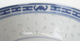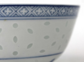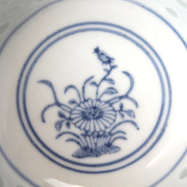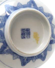 Ciotolina in porcellana cinese bianca e blu con decoro di fiori, cm h 6, diam. cm 11,5, marchio alla base, XX secolo.