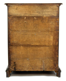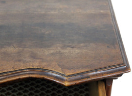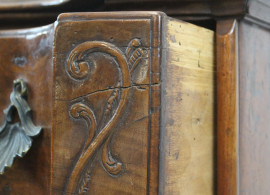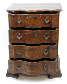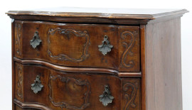 Comò in noce, XVIII secolo, piano e fronte di linea sagomata a quattro cassetti, piedi a mensola, finiture in bronzo, cm h 91,5x69,5x48, (difetti).