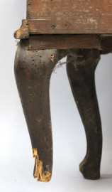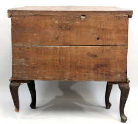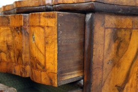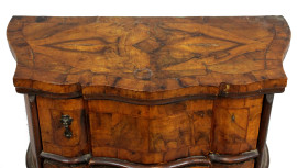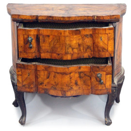 Comodino in noce e radica, inizi XX secolo, piano di linea sagomata, fronte a due cassetti, particolari intagliati, cm h 69,5x64x38, (difetto alla gamba posteriore).