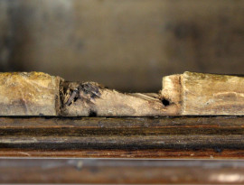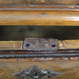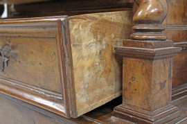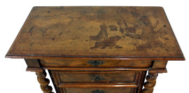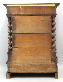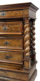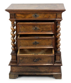 Comodino in noce, XIX secolo, piano di linea rettangolare, fronte a quattro cassetti e quattro montanti a torciglione, cm h 86,5x65x33, (difetti).