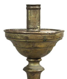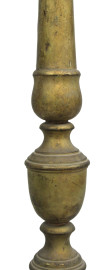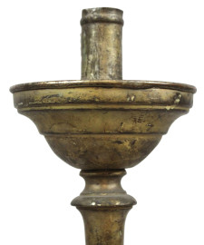 Coppia di candelieri in metallo dorato, fusto poggiante su base a tre zampe zoomorfe, cm h 64, XX secolo, (difetti).