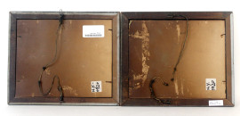 Coppia di dipinti raffiguranti composizioni astratte, tecnica mista su carta, cm 20x25, entro cornici