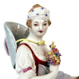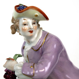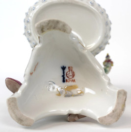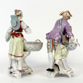 Coppia di sculture in porcellana policroma raffiguranti Lui e Lei con ceste porta bon-bon, cm h 22, marchio KPM Berlino.