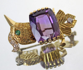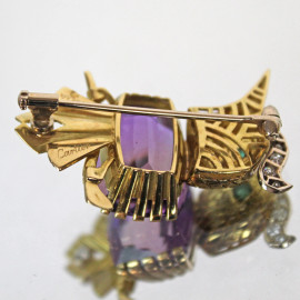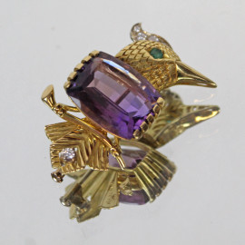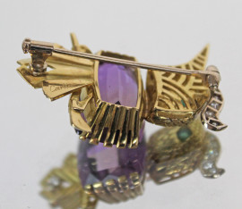 Coppia di spille in oro 18 KT a foggia di volatili, con ametista e topazio, smeraldi e brillantini, marcati, gr. tot 36,1.